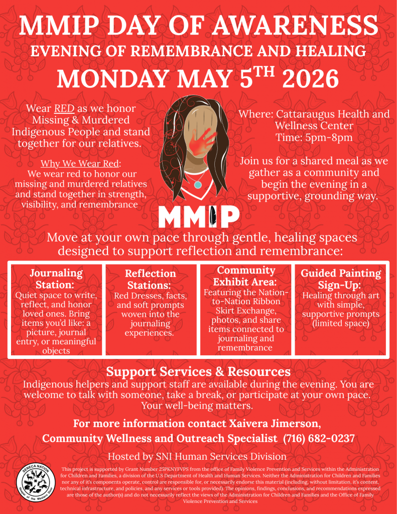 Join the Seneca Nation Human Services Department for an evening of remembrance and healing in honor of Missing & Murdered Indigenous People Day of Awareness. Gather as a community to enjoy a shared meal and interact with designated healing spaces dedicated to reflection and remembrance. Wear red to honor Missing & Murdered Indigenous People.