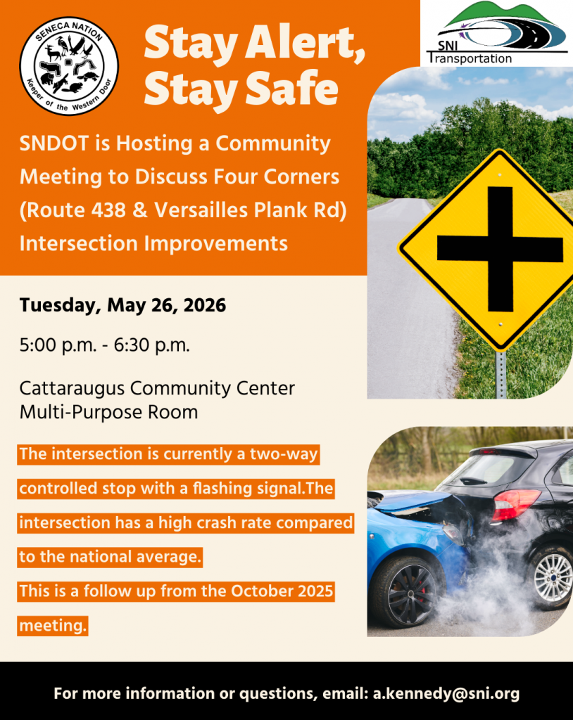 Seneca Nation DOT is hosting a community meeting to discuss Four Corners (Route 438 & Versailles Plank Rd) intersection improvements.