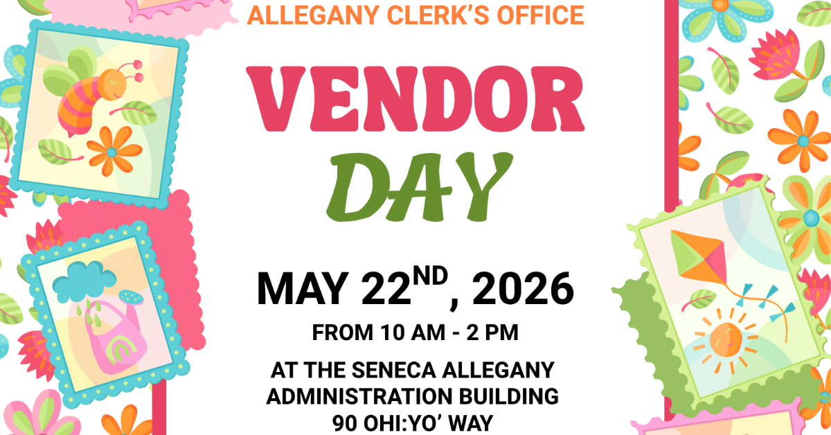 Check out the Allegany Clerk's Office's Vendor Day on May 22, 2026 featuring food, crafts, art, and beadwork. For more information or to sign up to be a vendor, call: … Continued
