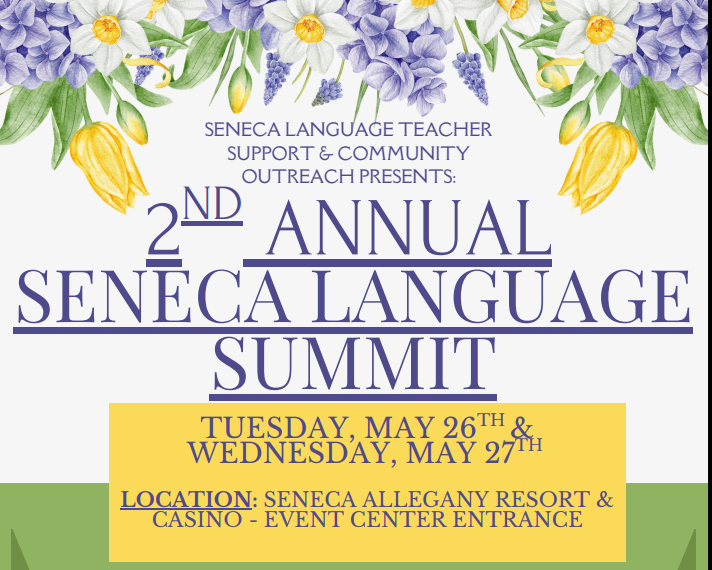 Join us for the 2nd Annual Seneca Language Summit Let's set some community language goals together! Hosted by Seneca Language Teacher Support & Community Outreach When: Tuesday, 5/26: 9am-4pmWednesday, 5/27: … Continued