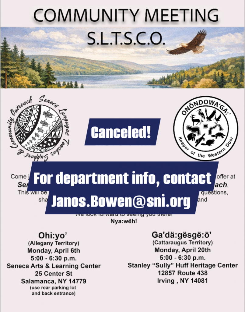 UPDATE: The Seneca Language Teacher Support & Community Outreach (SLTSCO) Community Meeting on the Cattaraugus Territory has been canceled.